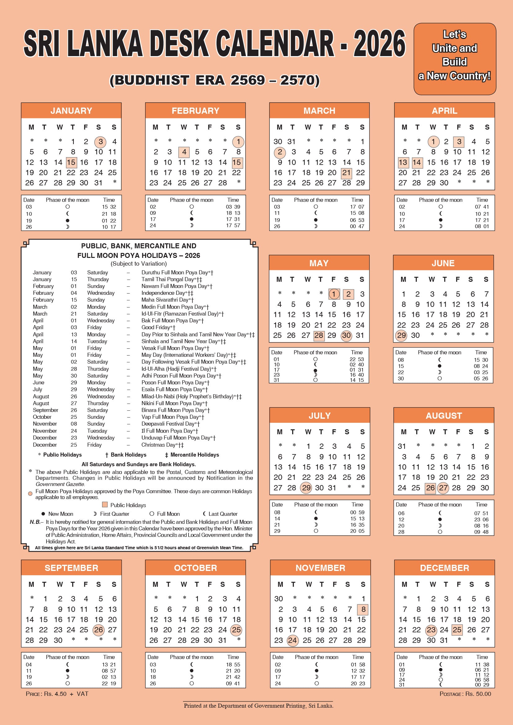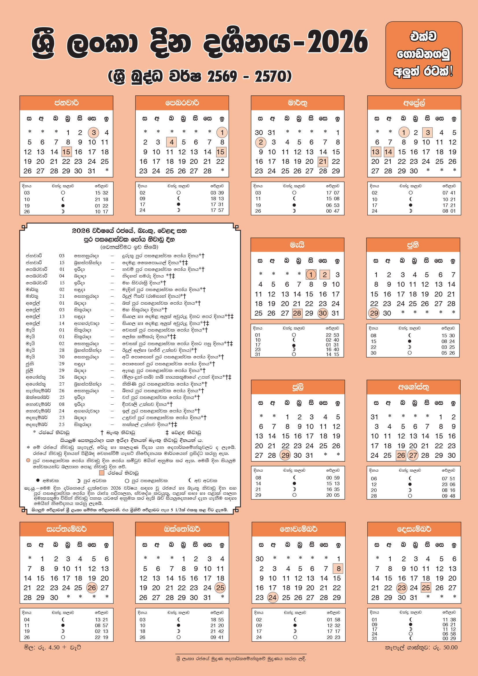 Zusätzlich zu den Samstagen und Sonntagen ist jeder Vollmondtag, der sogenannte Poya-Tag, ein gesetzlicher Feiertag in Sri Lanka. Dies hat dazu geführt, dass es jeden Monat mindestens einen zusätzlichen Feiertag gibt, es sei denn, der Poya-Tag fällt auf ein Wochenende.