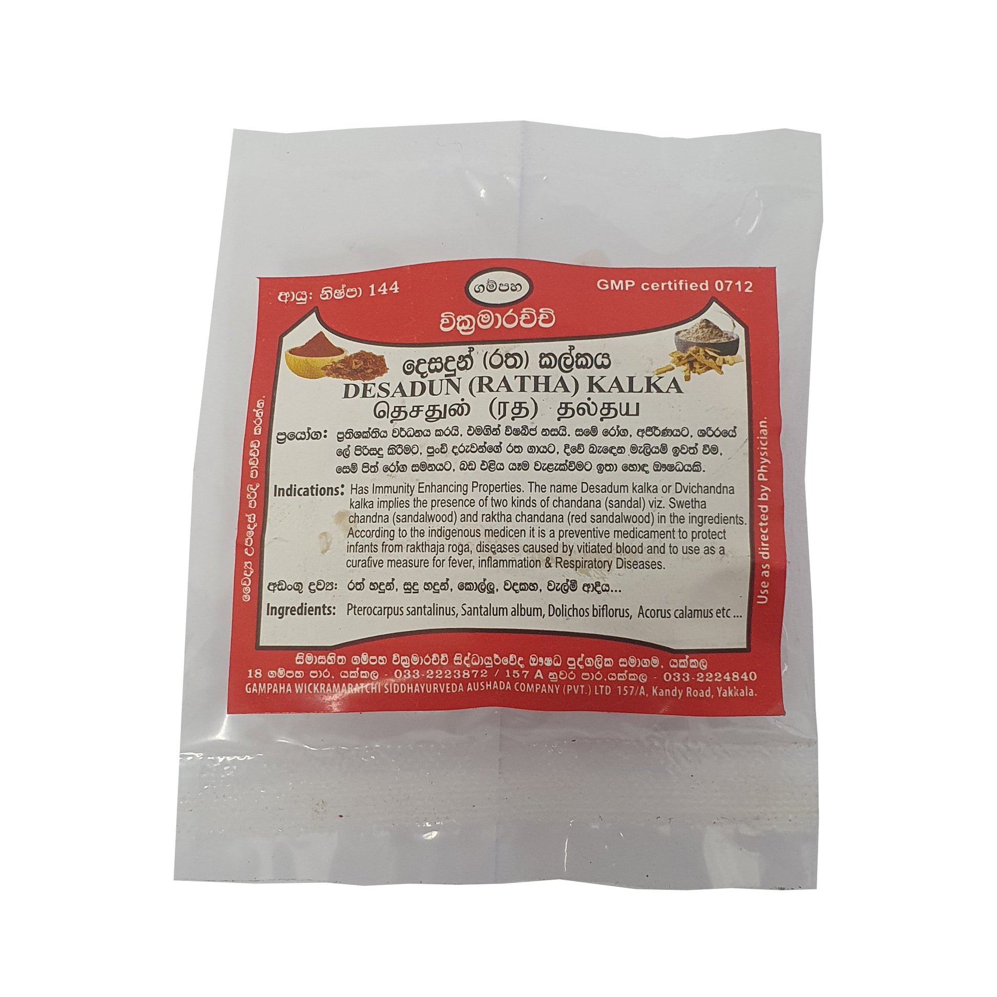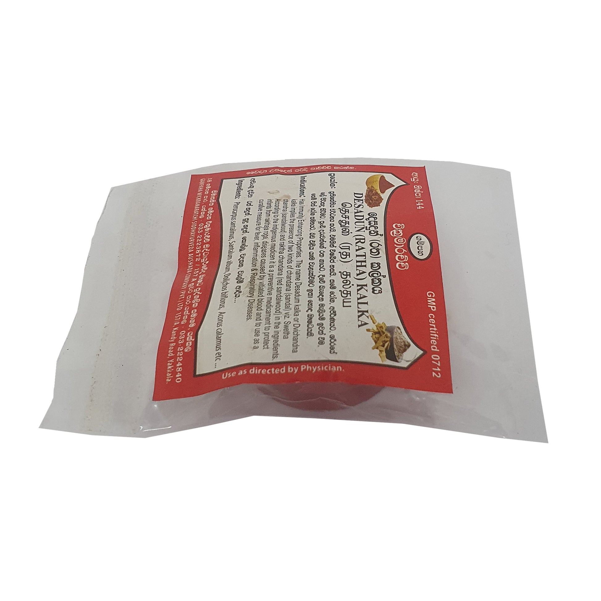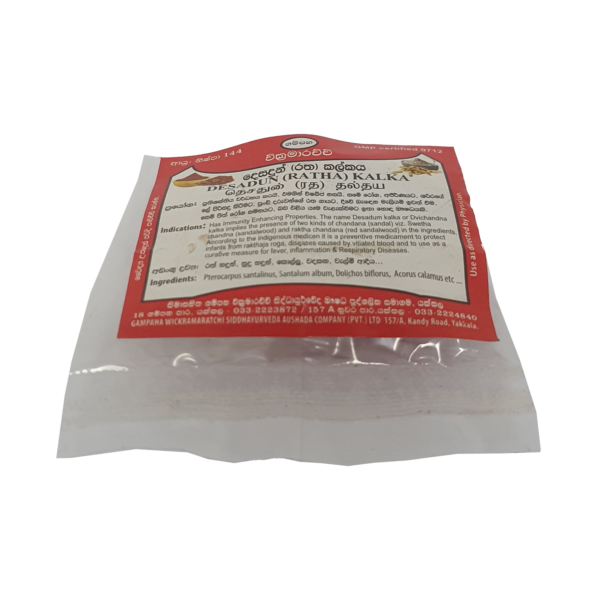 Gampaha Wickramarachchi Desadun Kalka (Ratha Kalka) ist eine traditionelle Heilmischung aus weißem und rotem Sandelholz, die für ihre immunstärkende Wirkung bekannt ist. Sie wird in der traditionellen Medizin vor allem zur Vorbeugung von Blutkrankheiten bei Säuglingen sowie zur Behandlung von Leberproblemen, Entzündungen und Atemwegserkrankungen eingesetzt. Dieses vielseitige Mittel wird aufgrund seiner natürlichen und wirksamen Behandlungsmöglichkeiten in der traditionellen Medizin geschätzt.