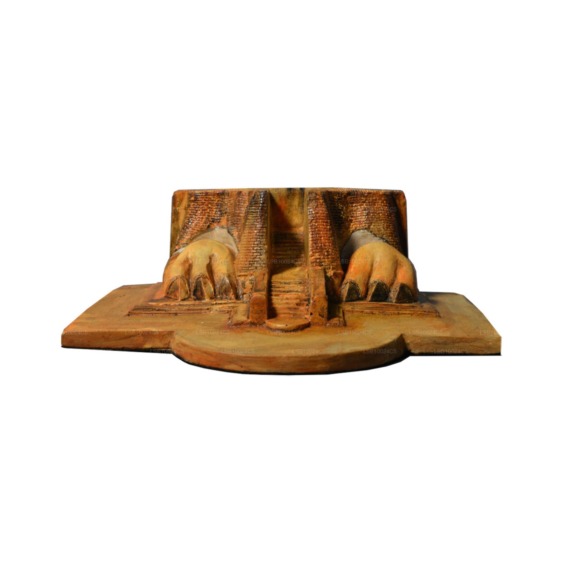 (SKU: LSB10024C5) Die Ruinen der Sigiriya-Löwentatzenskulptur sind über die von Spiegeln umgebene Treppe zugänglich. Der Eingang zum königlichen Palast ist der Name des „Sigiriya-Löwenfelsens“. Der ursprüngliche Eingang erfolgte durch eine riesige löwenkopfförmige Backsteinskulptur. Heute sind von dieser Skulptur am Fuß des Felsens nur noch ihre Pfoten übrig. Die überwältigende Natur der Löwenskulptur zum Zeitpunkt seines Besuchs wird in einem seltenen Gedicht auf der Spiegelwand von Sigiriya (irgendwann zwischen dem sechsten und dreizehnten Jahrhundert) beschrieben. Wo sich das Maul der Löwenstatue befand, beginnt die Treppe, die zur Spitze des Sigiriya-Felsens hinaufführt. Diese traditionelle Nachbildung stellt die Pfoten des Sigiriya-Löwen dar.